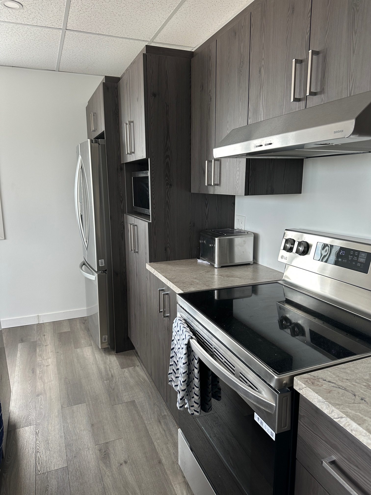 Air climatisée, TV, wifi et literie complète incluse. Salon et cuisine commune. Stationnement sans frais. Ménage régulier inclus. Commerces à proximité. (Dépanneur, poste d’essence, épicerie, guichet automatique, restaurants)